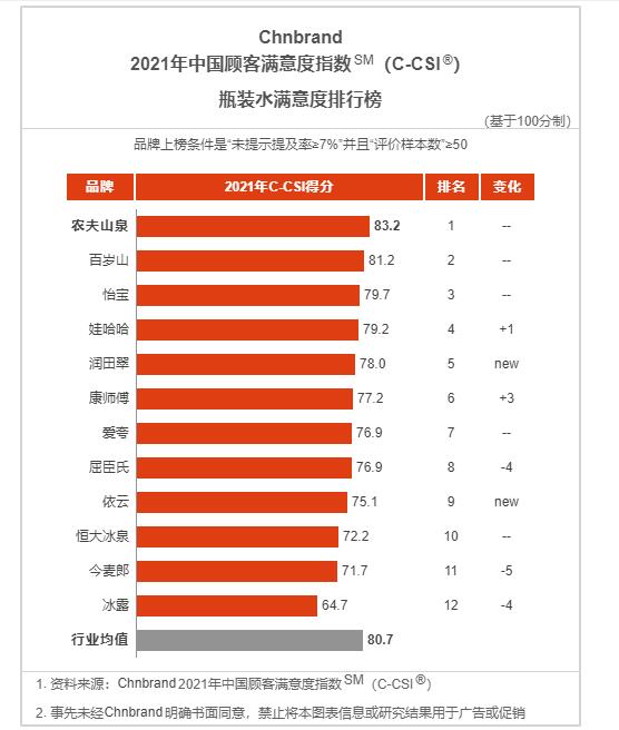 以下是Chnbrand中国顾客满意度指数SM (C-CSI®)往年瓶装水行业品牌排名: