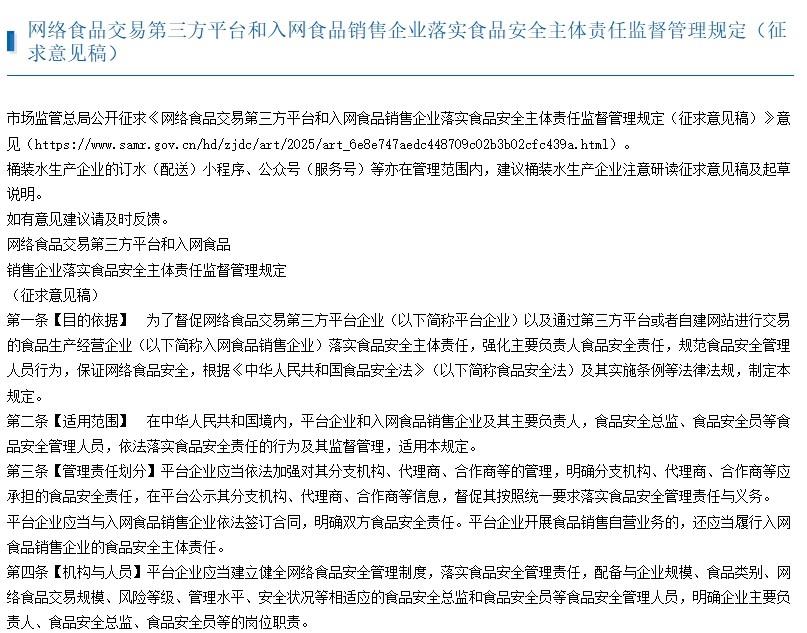 网络食品交易第三方平台和入网食品销售企业落实食品安全主体责任监督管理规定(征求意见稿)